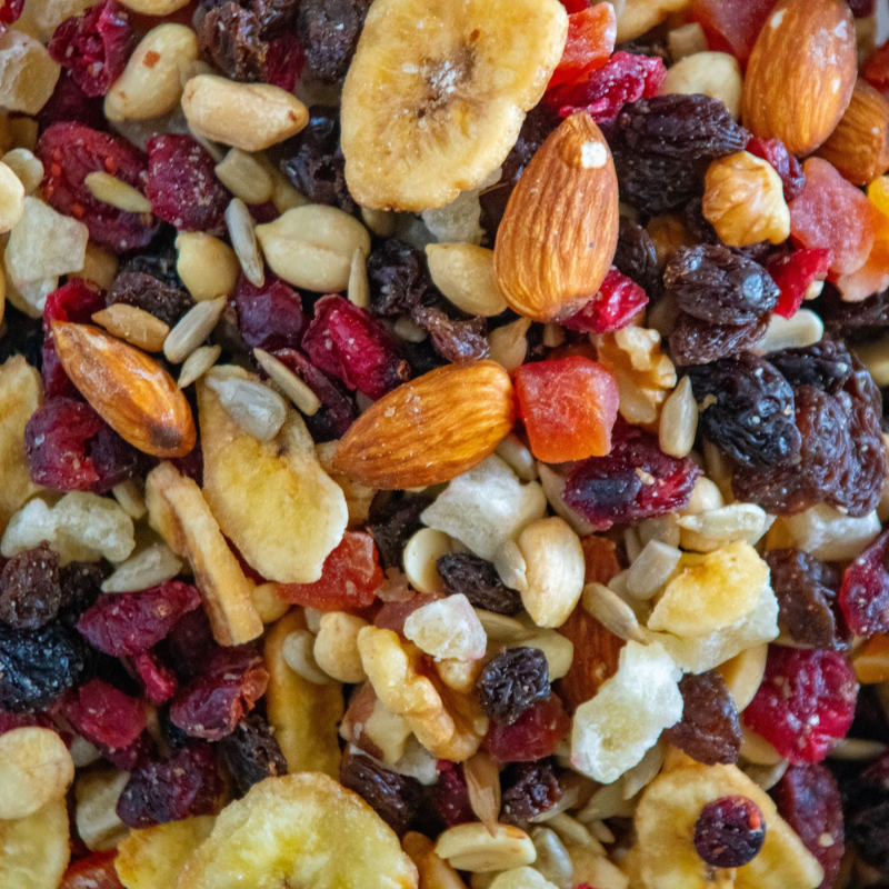 Dry roasted Peanuts, sunflower seeds, cranberries, raisins, banana chips, and almonds. A lovely way to start your morning.